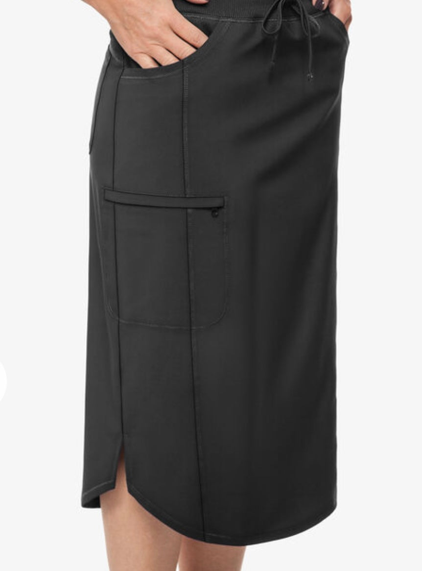 The Cherokee Infinity Women's 5-Pocket Stretch Cargo Scrub Skirt features a shirtail hem, plus side vents make it polished and flexible. More features includes contemporary fit, rib-knit covered elastic waistband with adjustable drawstring, 2 front slash pockets with rib-knit trim, 1 right zippered welt cargo pocket, and 2 back patch pockets. Approximate length for size M is 29 1/2. It is designed with certainty antimicrobial fabric technology which reduces the bacteria that cause odor and offers a perfect fit for all-day comfort.