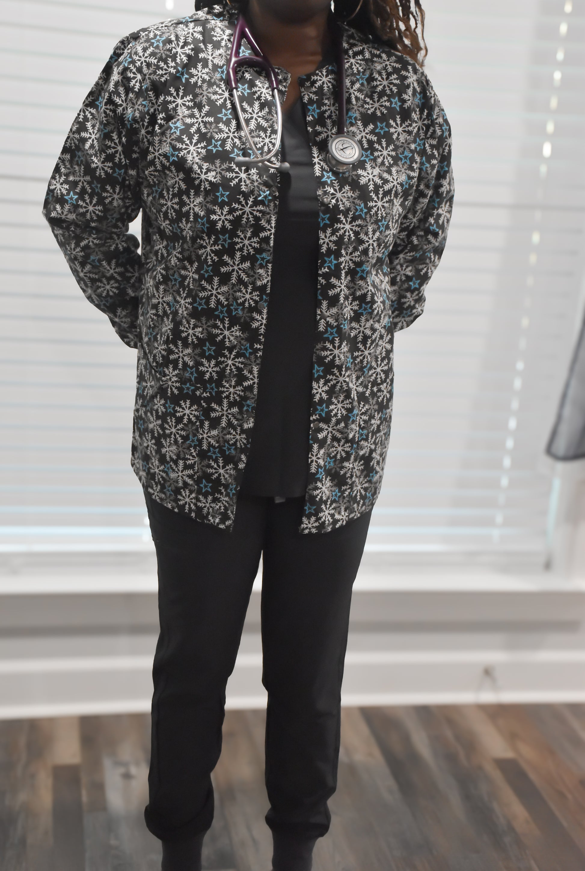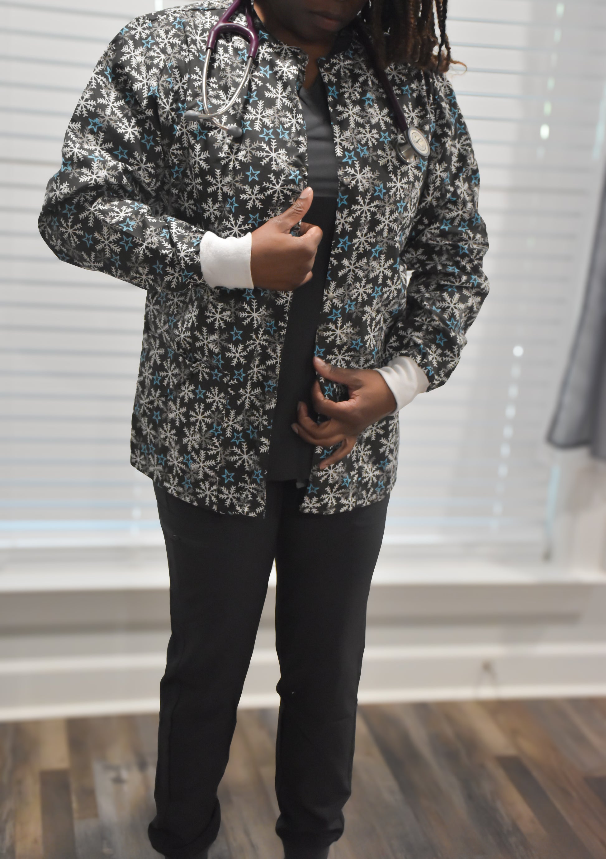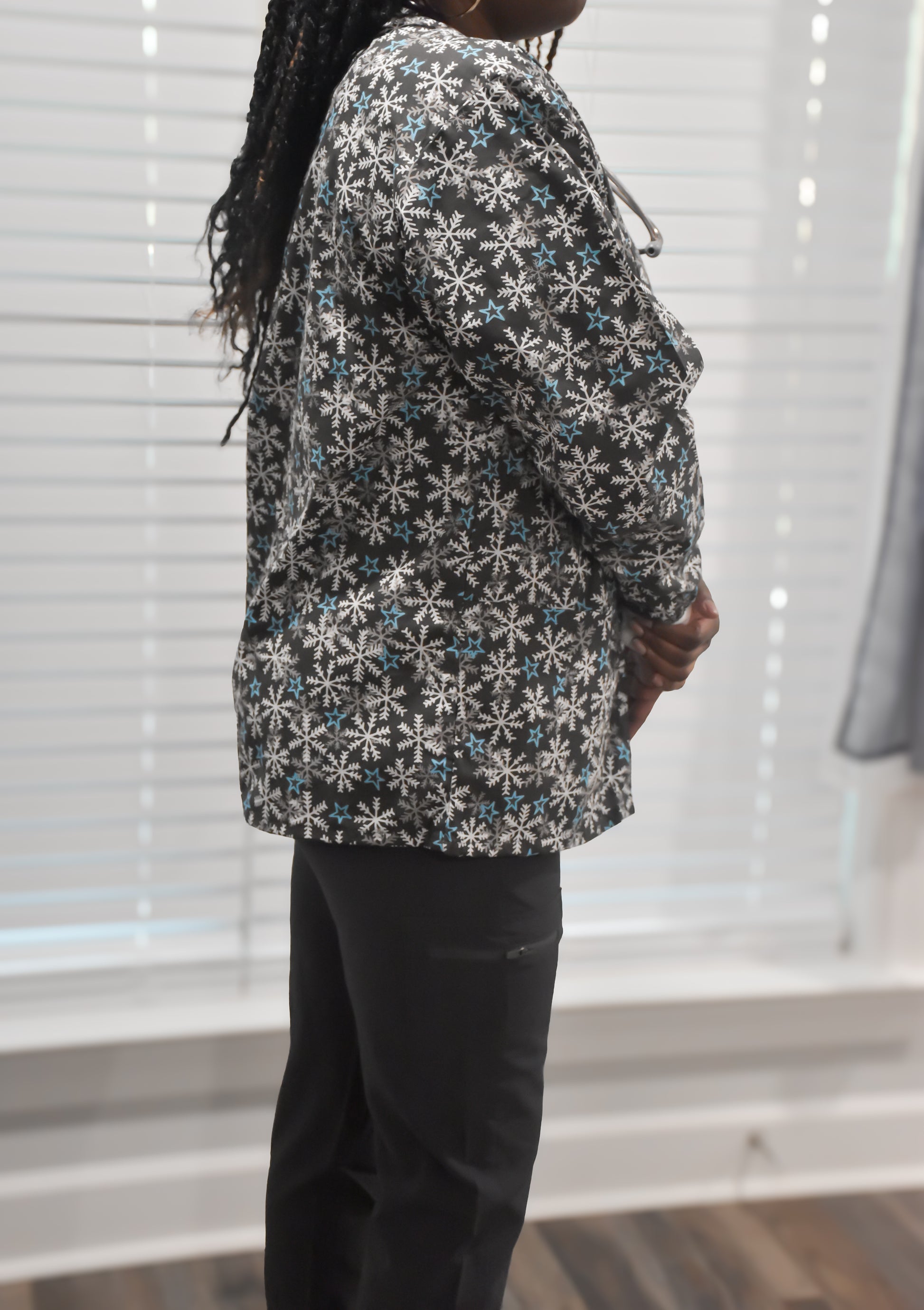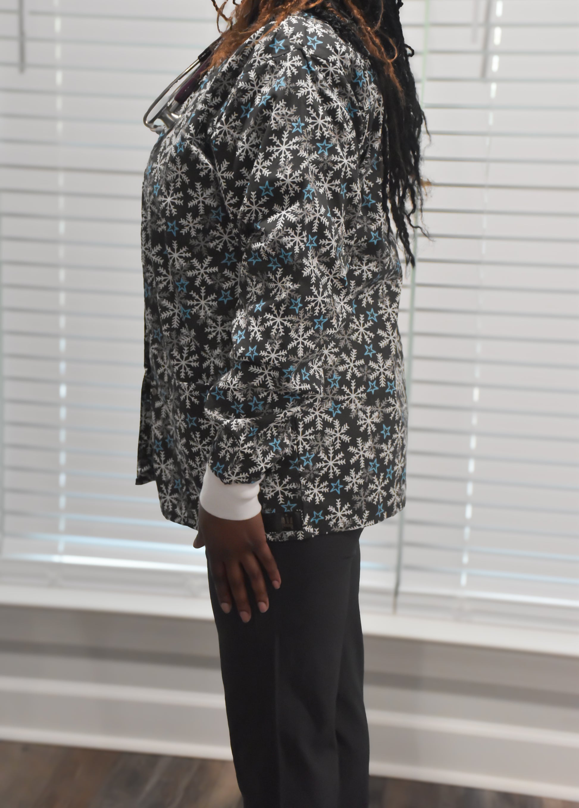 The Printed Jacket With 2 Pocket Unisex Full Sleeve With Rib - Star & Snow has a round neck warm up with knit cuffs and front snaps. The jacket is just in time for the Christmas holiday while it's cold outside! The jacket is machine washable with color clothing. Material: 48% cotton and 52% polyester.