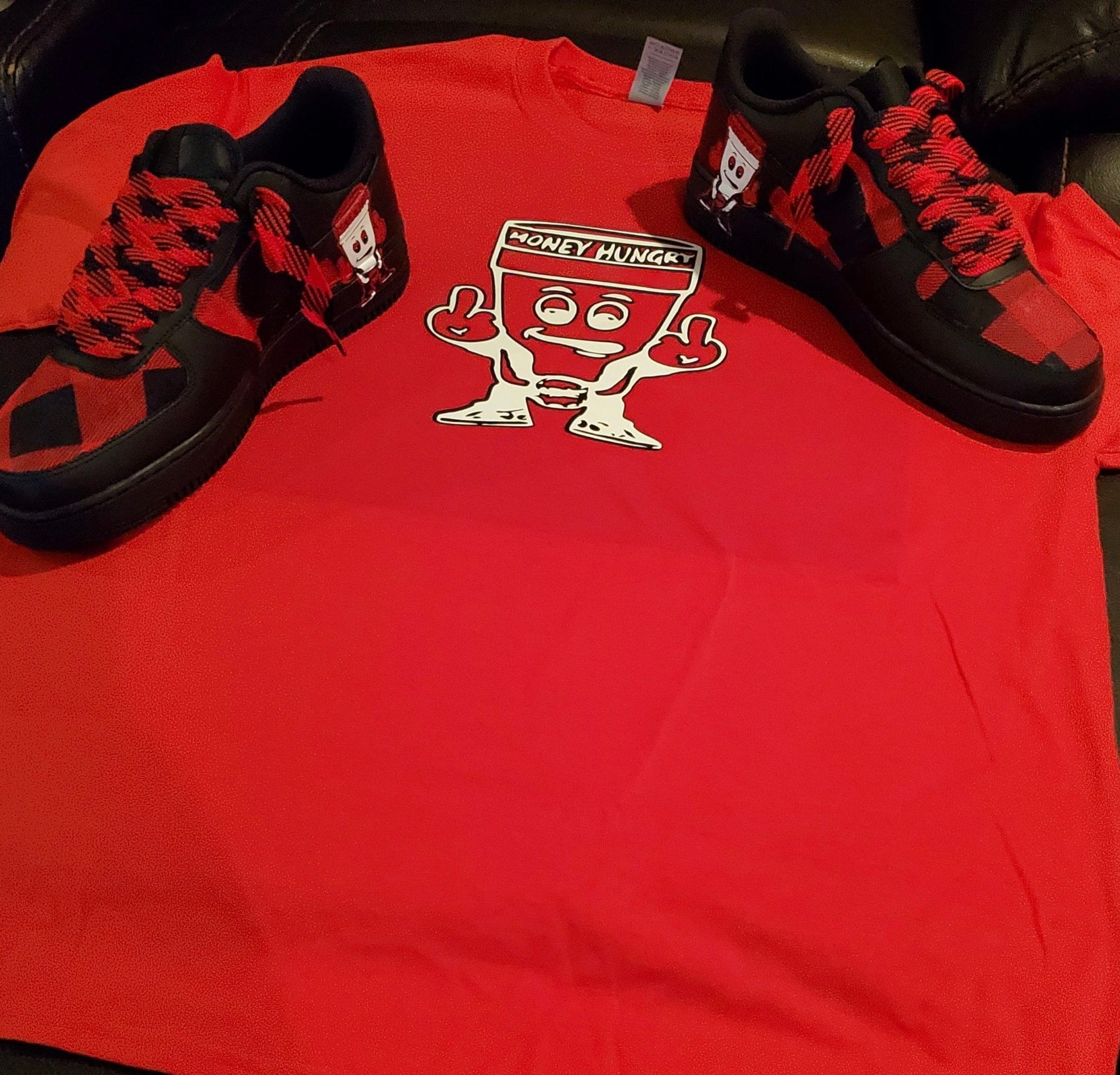 The Money Hungry Plaid AIR FORCE 1 (AF-1) shoe highlights AF-1 DNA with a bold, new look. It is lightweight comfort, which entails a foam midsole and a grooved outsole, and flexible. The material is a mix of leather and synthetic materials. With this order you will receive the "Money Hungry AIR FORCE 1" pair of shoes along with one t-shirt that matches as pictured. The t-shirt color will be red as pictured. Please be sure to pick a shoe size and a t-shirt size when ordering.